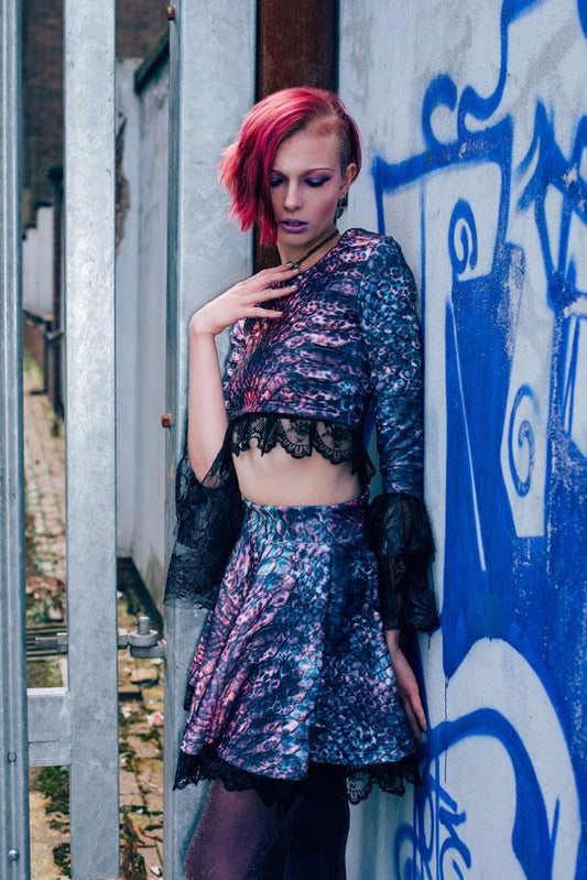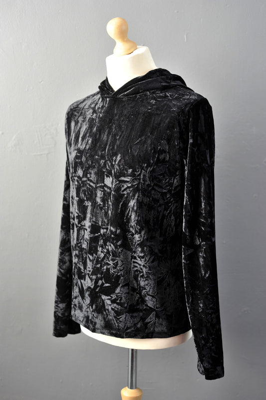 Mens Black Velvet Crop Top with Metallic Blue Print