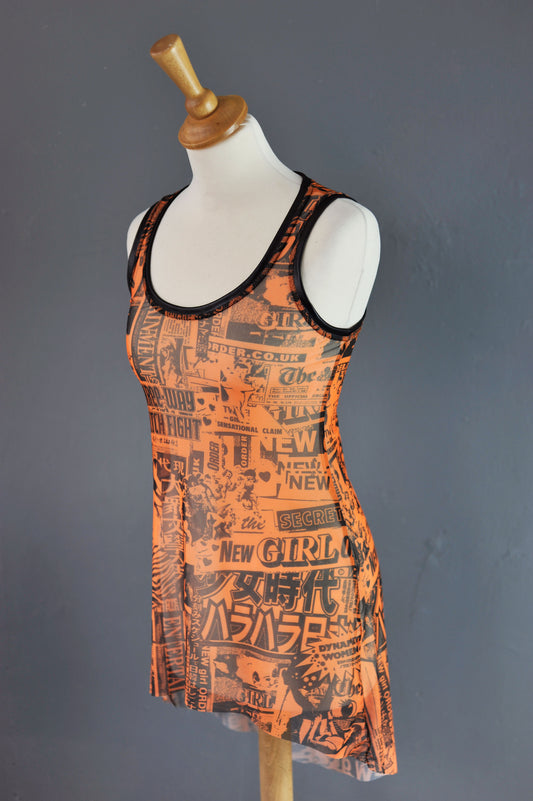 Sheer Orange Mesh Tank Top with Newspaper Headlines and Kanji Print