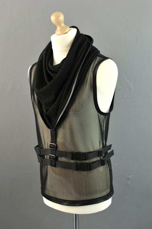 Mens Cyber Cowl Mesh Tank, Futuristic Hooded Net Top