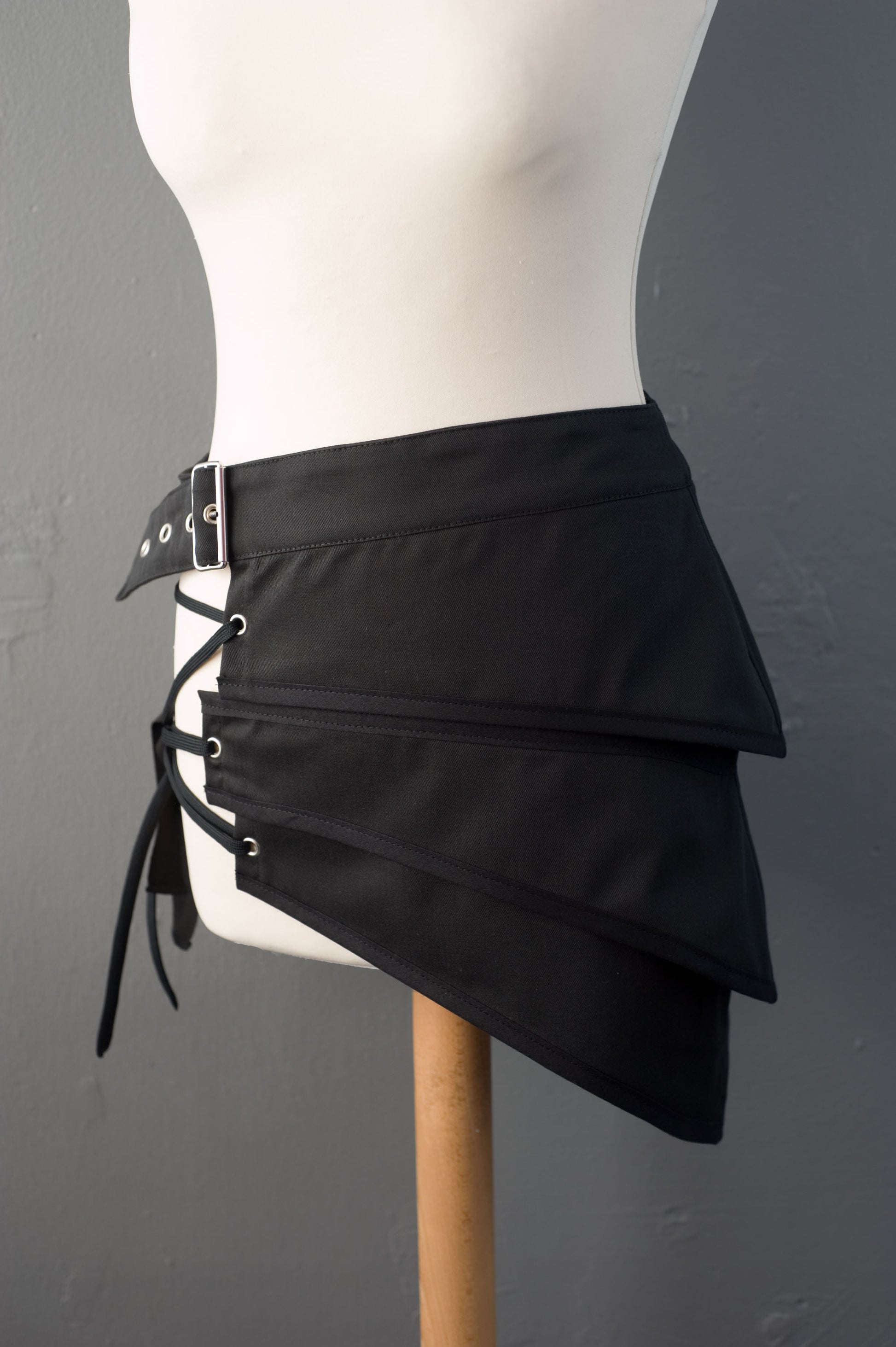Made entirely from 100% cotton this mini version of our Apocalypse Max skirt features asymmetric overlapping 'scales', fastened at one side with adjustable lacing, and has a slanting waistband with buckle fastener.