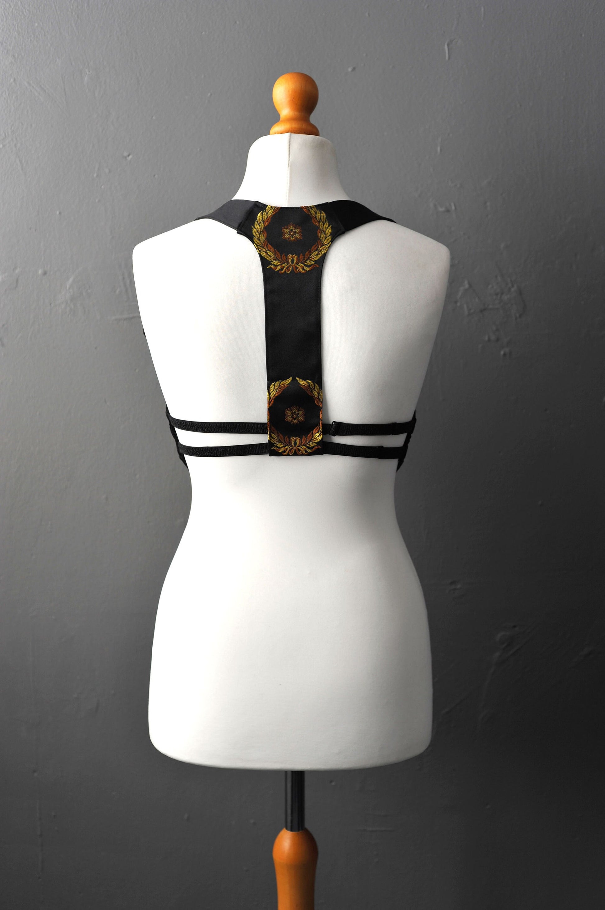 Made with a lush black brocade with golden laurels, flanked with side panels of black cotton velvet, and lined with a heavy black satin, this is beautifully easy to put on, with adjustable elastic straps at the back that fasten with a simple bra style hook, along with shoulder straps with adjustable ribbons to get that fit just right!