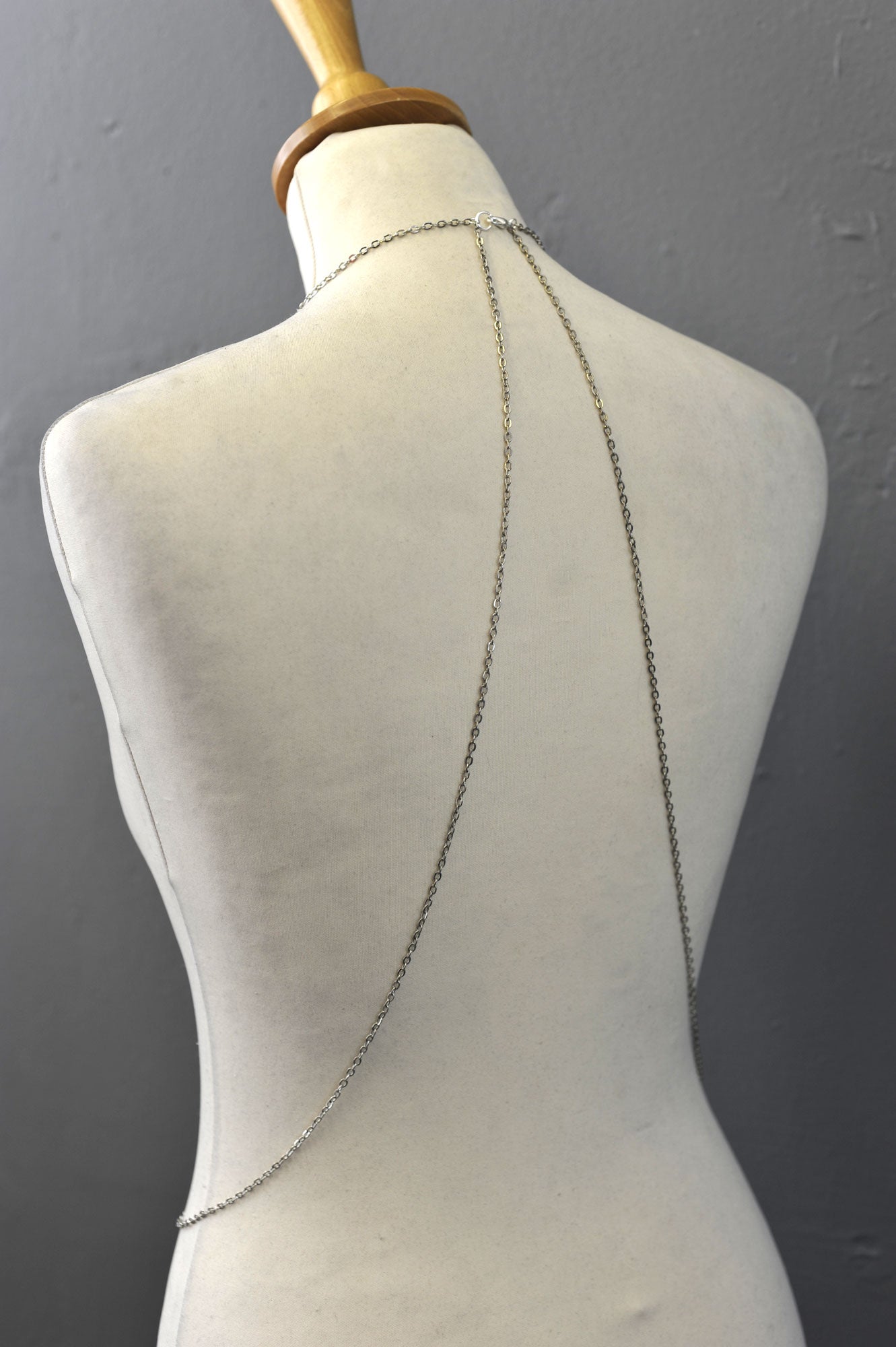 A simple silver plated brass chain harness is a delicate counterpoint to the leather and metal, and fastens at the neck with a lobster clasp.