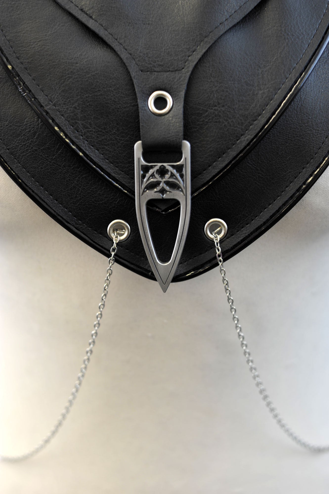 Made from vegan leatherette, and edged with shiny black pvc, this layered bib necklace features a solid stainless steel d-ring centerpiece, shaped and etched like a gothic arch.